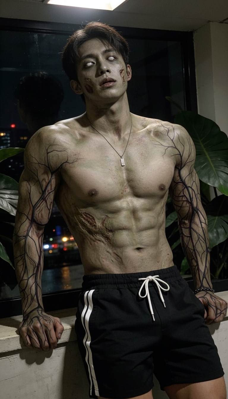 A subject undergoes a zombie decay transformation—skin turns gray and lifeless as flesh begins to rot and deteriorate. Dark veins spread across the body, and patches of decay expose damaged texture beneath. The eyes become dull and empty, with a lifeless stare. Subtle movements feel stiff and unnatural, creating a chilling undead presence with a grim, decaying atmosphere.