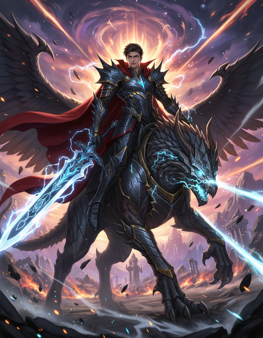 High-end anime cinematic illustration of the subject from the reference image, identity preserved. The subject wears an overpowered battle outfit with exaggerated armor, glowing aura, and energy effects. Riding a massive legendary creature with dynamic pose. Explosive background, energy blasts, wind effects, dramatic lighting. Epic, intense, final-battle atmosphere.