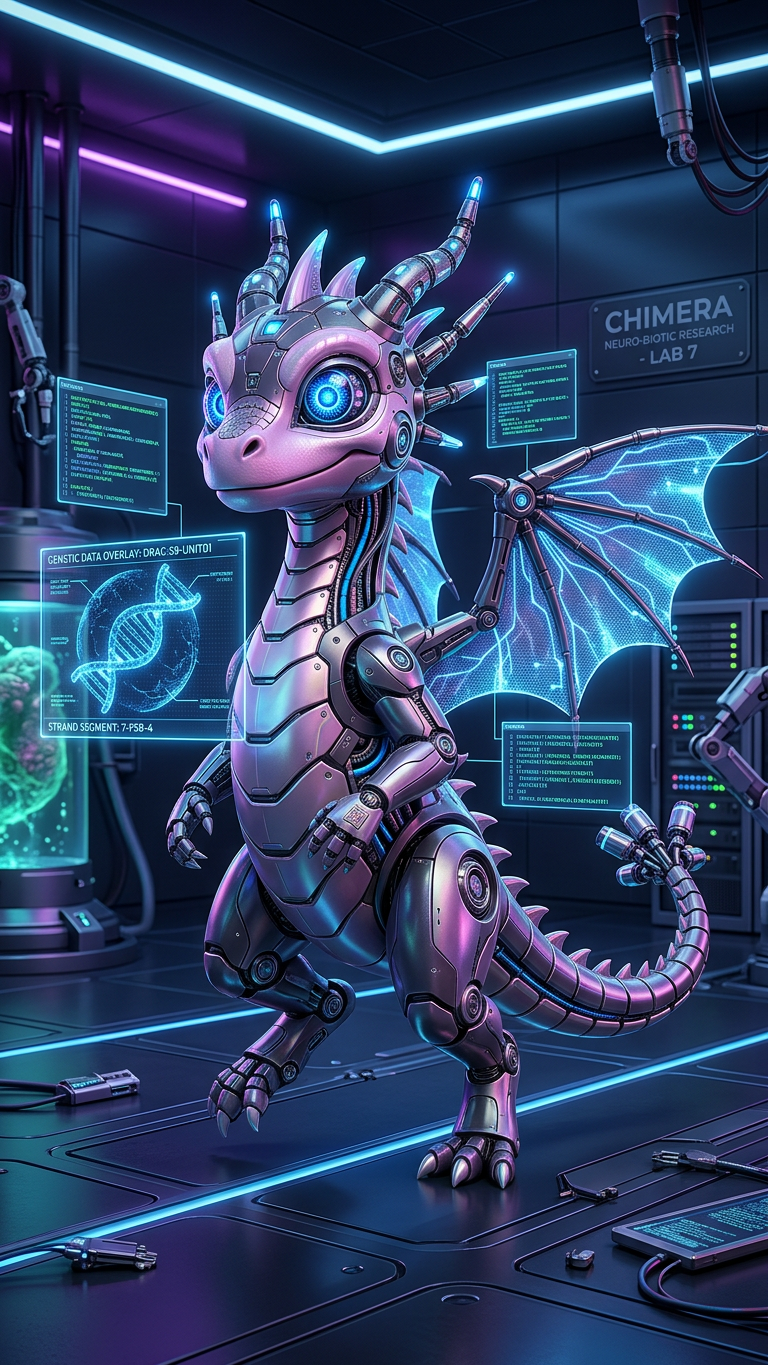 Subject transforms into an advanced cybernetic entity with glowing blue eyes and intricate mechanical enhancements, moving through a neon-lit futuristic laboratory. Holographic screens display DNA strands and flowing code. High-tech, bio-engineered environment, cinematic lighting, sleek and futuristic atmosphere.